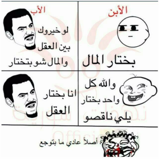 الابن: بابا انا عم دخن !! الاب: لك شوفو ع هل وقاحة وشقد صرلك عم تدخن ولا ابن الكلب ؟؟ الابن: من وقت ما شفتك بالسوق مع سكرتيرتك وتاكلو شاورما الاب: اي معلش بابي اصلن انا كنت اصغر منك وبدخن ههههههه