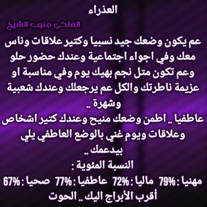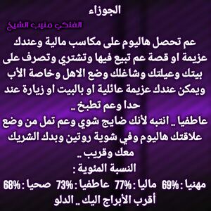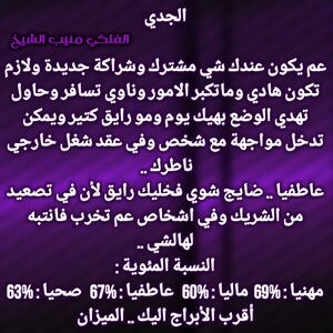 أشهر قادمة رح تغير فيها امور عندك ورح تخلص من اشخاص وتنهي شراكة وبشكل عام عم تفتح ابواب سفر وتبلش شغل جديد ولازم تعتمد على نفسك بمشروع بيعطيك قيمتك وعندك نشاط كبير وفرص مالية بالسنوات الجاية رح تعوضك وكمان الحب رح يطور بعلاقة لارتباط وكل عام وانت بخير ..
