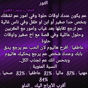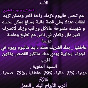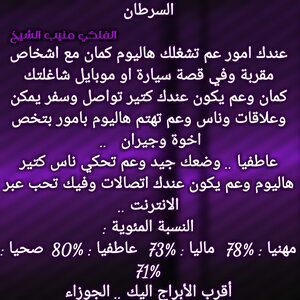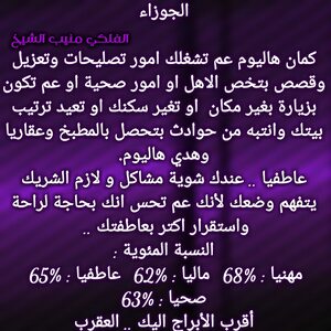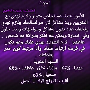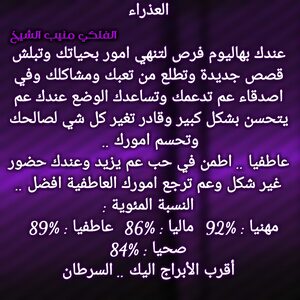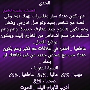 عم تنهي مرحلة صعبة الك وفي اخبار حلوة رح تجيك تباعا وكمان بنفس الوقت عندك اخبار بتفرحك وامور عم تمشي لصالحك وفكر بقصة تعطيك إضافة وغير بحياتك ودور على شخص بيمنحك الاستقرار العاطفي وخاصة انو فرص الارتباط كبيرة عندك والوضع المالي بدو شوي صبر وبكون تمام وكل عام وانت بخير .