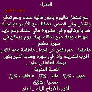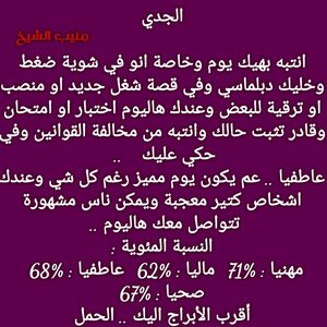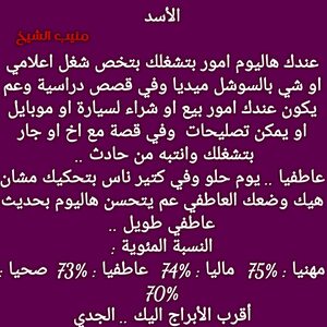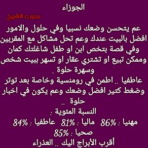 عندك امور كتير كانت مؤجلة وبلشت تتيسر وفي اخبار حلوة بتخص شغل جديد ممكن تبلش فيه وبنفس الوقت عم تفتح ابواب السفر وعم يكون عندك شخص عم يدعمك كتير بحياتك واستغل حضورك وقدرتك على كسب محبة الناس وفي اخبار بتخص المال وفرص قادمة وكل عام وانت بخير ..