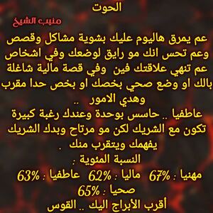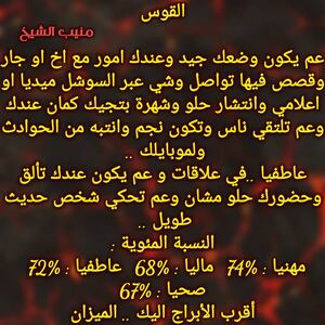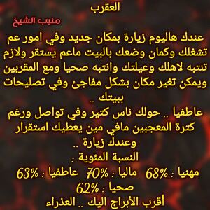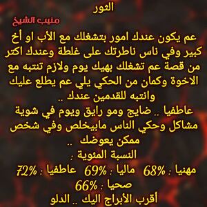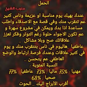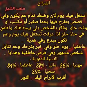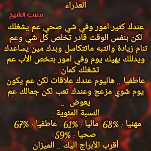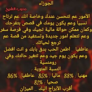 عندك فرص انك تتالق وتكون تحت الاضواء بالفترة القادمة وخاصة انك من الاشخاص يلي عم يلفتو النظر وفي اخبار حلوة عندك مهنيا بشغل بيدعمك وعم تحس انو مكانتك عم ترجع وعم تعوض اشخاص خسرتن باشخاص جدد افضل وفي خبر حلو عاطفي مع شخص مهم وكل عام وانت بخير ..