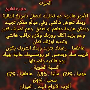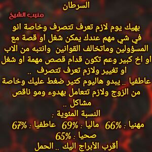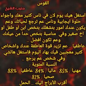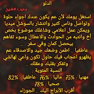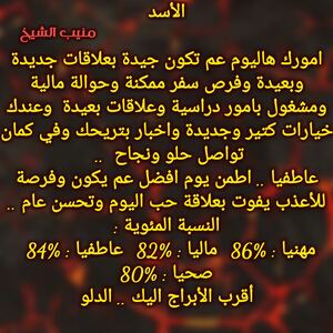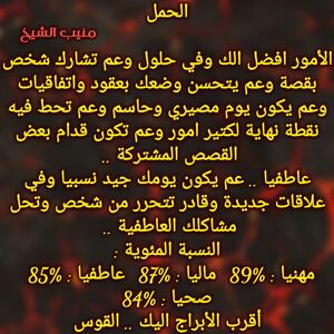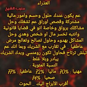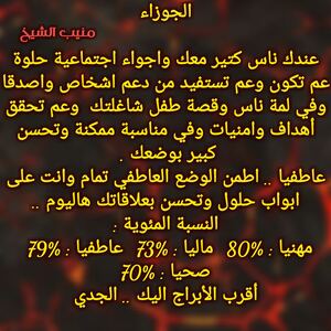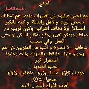 عم تستفيد من فرص كبيرة بمجال العمل وعندك مبالغ قادمة وبنفس الوقت عم تلاقي اىتقدير يلي بدك وفي اشخاص عم تدعمك وتكون معك والوضع العام عم يمشي لصالحك وفي اكتر من شخص جديد ومهم بحياتك وعندك فرصة اضواء وعلاقات ممكن توصلك للارتباط وكل عام وانت بخير ..