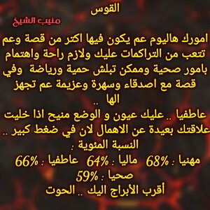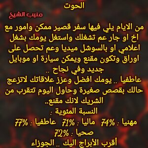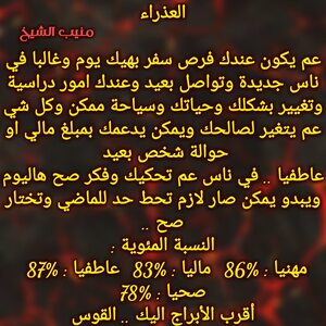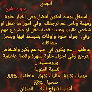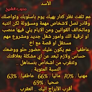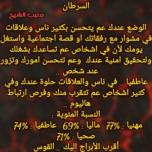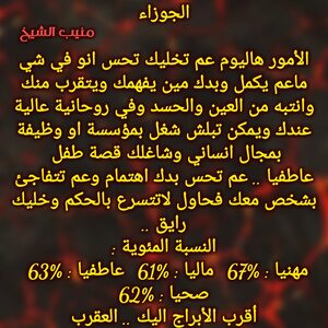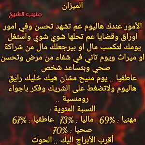 الأمور عندك افضل وفي تطورات مهمة وخاصة انك مقبل على نجاحات قادمة وفي اموال رح تجيك ورح تعرف الناس قيمتك من جديد وحاول تفكر بمشروع خاص فيك ولازم تفتح ابواب الشهرة كمان وعندك فرص ارتباط وعلاقات رح تطور وخاصة السنتين القادمتين وكل عام وانت بخير ..