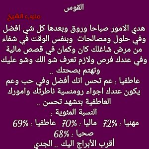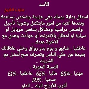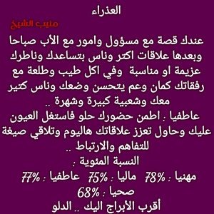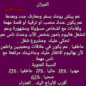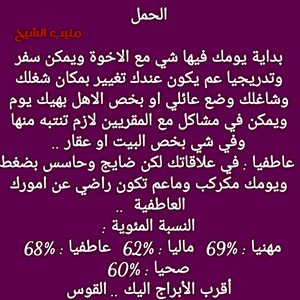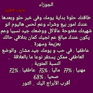 عندك شي مهم قادم ويمكن شغل جديد ورح ترتفع مكانتك بين الكل وعلاقاتك عم تتحسن وفي باب للشهرة وكمان فرص الارتباط رح تكون موجودة بالسنتين القادمين وكمان في مبالغ مالية رح تجيك تباعا ولازم تعرف تهتم بحالك وفي شفاء من مرض شاغلك وتحسن عائلي وكل عام وانت بخير ..