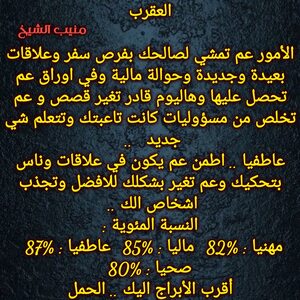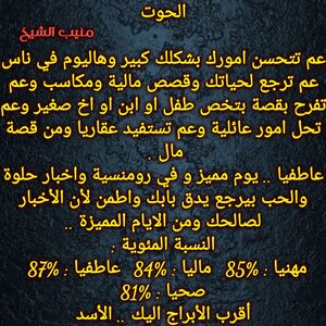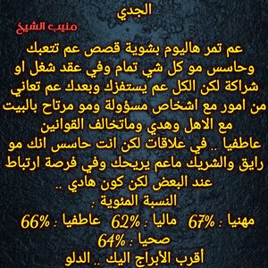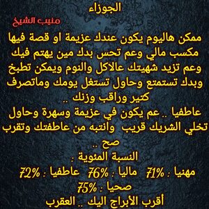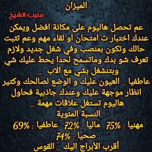 مولود اليوم 13أكتوبر .. مسيطر ، ذكي ، محبوب ، اجتماعي ، حسي وعملي بنفس الوقت ، يفكر بعقله ويتعامل احيانا بقلبه لكنه عادل ويبحث عن التوازن في حياته ، يمتلك شخصية محببة ويعرف كيف يحصل على تأييد الجميع ، جميل شكلا ويمتلك جاذبية خاصة لديه دائما قدرة على التعلم واحساس كبير بما حوله، كما أنه يتأخر في الحب يستقر على شخص يناسبه ويكمله ..