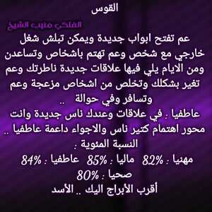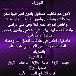 عندك هالفترة امور جديدة وحاول تغير افكارك وتبلش بمكان مختلف وناطرك مرحلة جديدة دراسيا واخبار حلوة بتخص المال ولازم تنهي علاقات متعبة بحياتك وتفكر باستقرار وارتباط وعندك اصدقاء عم تساعدك بكتير امور وفي تغيير وسفر وعلاقات جديد وكل عام وانت بخير ..