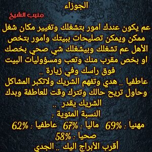 سيكون لديك في الفترة القادمة لديك امور كثيرة وتبدأ في مكان مختلف وتهتم بامور عائلية وتغير من حياتك وتفتح ابواب جديدة وهناك اشخاص تتقرب منك وفرص مالية تاتيك وايضا هناك علاقة عاطفية مع شخص بعيد ويجب عليك ان تبحث عن الاستقرار وتكون هادئ وكل عام وانت بخير ..