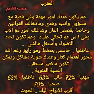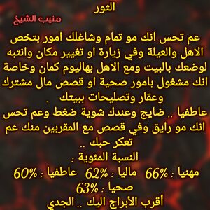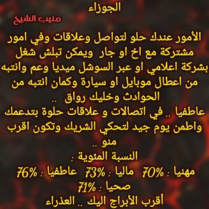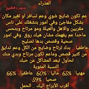 الأمور تتغير لصالحك تدريجيا وهناك اخبار جيدة تدعمك بالحظوظ والبدايات وايضا هناك أشخاص تتقرب منك ومكاسب مالية وهدايا قادمة اليك ويجب عليك ان تفتح ابواب جديدة وتكون أكثر اهتمام بمن حولك ولديك اخبار تخص اخ او جار وعلاقات ومصالحات وشفاء لمرض وكل عام وانت بخير ..