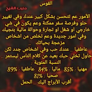 مولود اليوم 8ديسمبر .. يمتلك ضحكة عريضة .. وجه بشوش . يحب التحدي .. يمتلك التفاؤل .. محظوظ ويصل لأبعد الأماكن .. يستطيع أن يعدي بطاقته .. يقدم النصيحة ويكون شديد الملاحظة .. عاطفي ويحب من قلبه .. قريب من عائلته ، لا يرضى بعدم التقدير او الاهمال ابدا ، ينجح في حياته ويصل دائما ، كمان انه يحاول ان يحل الامور بذكائه وسرعة البديهة لديه ..