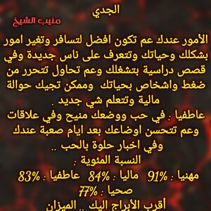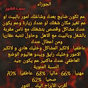 عم تشهد حياتك اخبار حلوة وبدايات وعم تخلص من ضغط كبير كان عليك مسبقا وتتقرب ترجع من عيلتك واهلك وفي امور عم تمشي لصالحك وعم يستقر وضعك بعد كتير قصص وفي فرصة انك تحصل على اموال عن طريق اشخاص والحب رح يكون تدريجيا وكل عام وانت بخير ..
