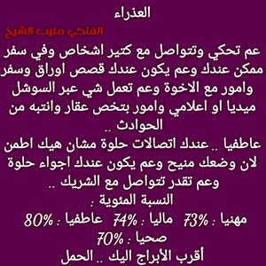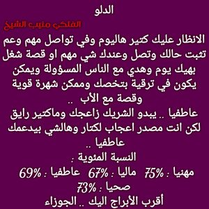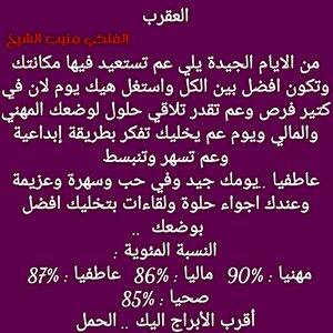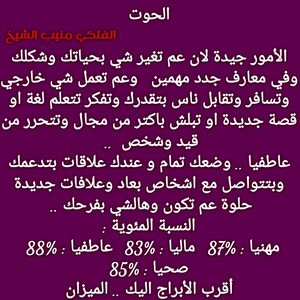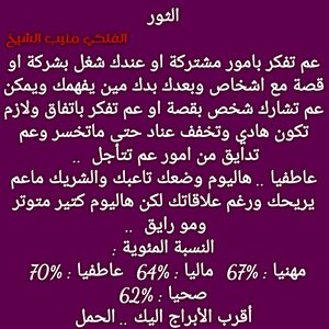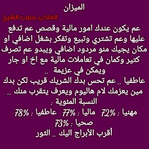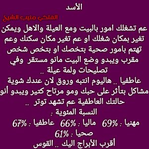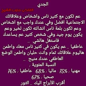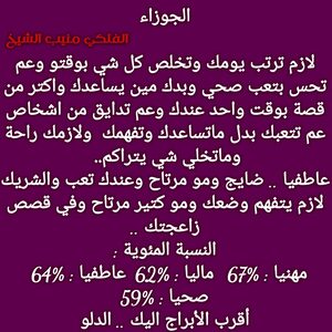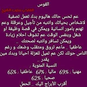 استغل الفرص المالية القادمة الك وعم تكون بمكان مختلف شوي شوي وعم تحس انك أفضل رح تخلص من مشاكل المقريين والعيلة شوي شوي ورح تستمتع بوقتك وفي امكانية نجاح وفكر بفتح امور جديدة وحاول تتعلم وناطرك تحسن بصحتك واخبار حلوة وكل عام وانت بخير ..