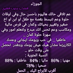 عم تكون قدام فترة لازم تعرف فيها مين معك ومين عليك وعندك اجواء حلوة عم تكون وفي استقرار عاطفي وعائلي قادم بعد مشاكل وتغييرات وبنفس الوقت في امور دراسية شاغلتك ولازم تهتم بامور صحتك وترتب كل شي وعندك خيارات جديدة وشراكات بتدعمك كمان وكل عام وانت بخير ..