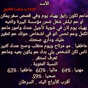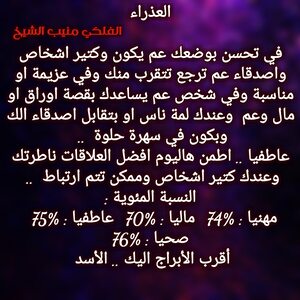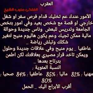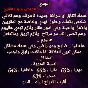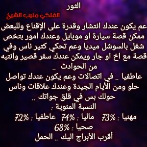 الأمور عم تتحرك لصالحك شوي شوي وفي اشخاص عم تتقرب منك شوي شوي وعندك تغيير مكان متوقع وفي تغييرات ببيتك وعيلتك وعم تحس انو في اشخاص مقربة عم تكون سند الك والبعض ممكن يسافرو او يغيرو مكان الإقامة وفي حب واجواء رومنسية قادمة لحياتك وكل عام وانت بخير ..