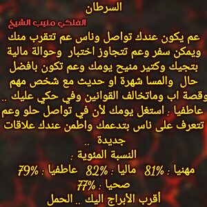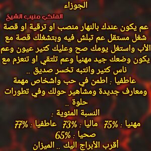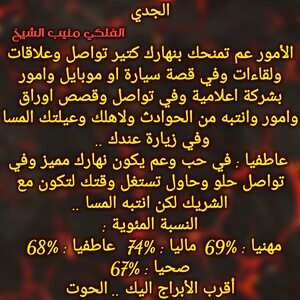 كتير قصص عم تتغير لصالحك ولازم تعرف تحسم امورك وفي ترقية او مكان أعلى عم تصل لالو بحياتك واستغل وضعك المهني وكمان الفرص المالية وعم يجيك دعم كبير من اشخاص مقربة ومن عيلتك وكل شي عم يتغير لصالحك شوي شوي ولازم تعرف تستغل وضعك لتصل وكل عام وانت بخير ..