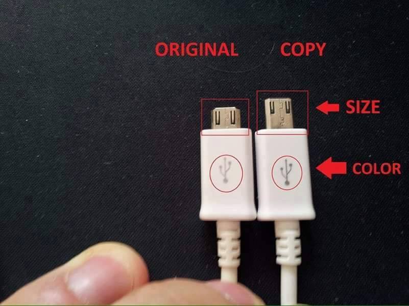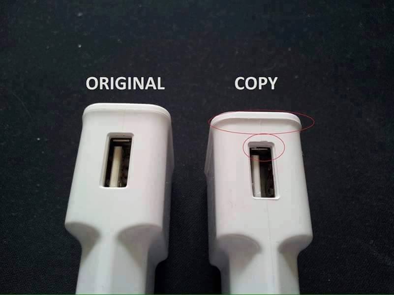 جميع هذه الصور التي سوف تشاهدها الآن تشير إلى بعض العلامات التي يجب عليك الإنتباه لها قبل أن تقوم بشراء شاحن الهاتف و دفع المال مقابله ، و كي لا أطيل عليك الحديث إليك الفرق بين الشاحن الأصلي و الشاحن المزيف في الصور التالية :