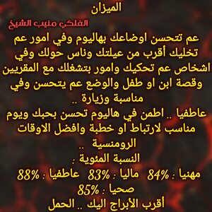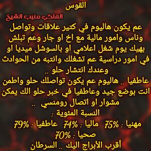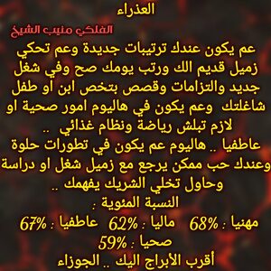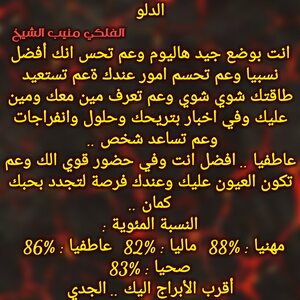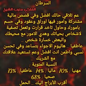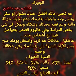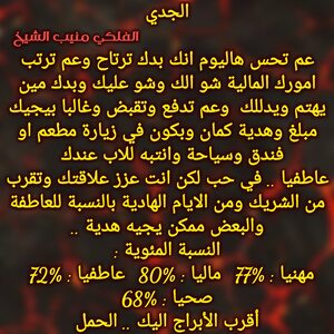 عم تقدر تفتح ابواب جديدة وعم يكون عندك مجال لتستفيد من اشخاص حولك وفي شخص بيجي وبكملك مهنيا او عاطفيا وبتلاقي حلول مالية بتجيك تباعا وفي مكاسب حلوة رح تحصل عليك ولازم تفكر كمان بوضعك الصحي وتعالج مرض شاغلك كان وفي خبر للسفر بعد وقت وكل عام وانت بخير ..